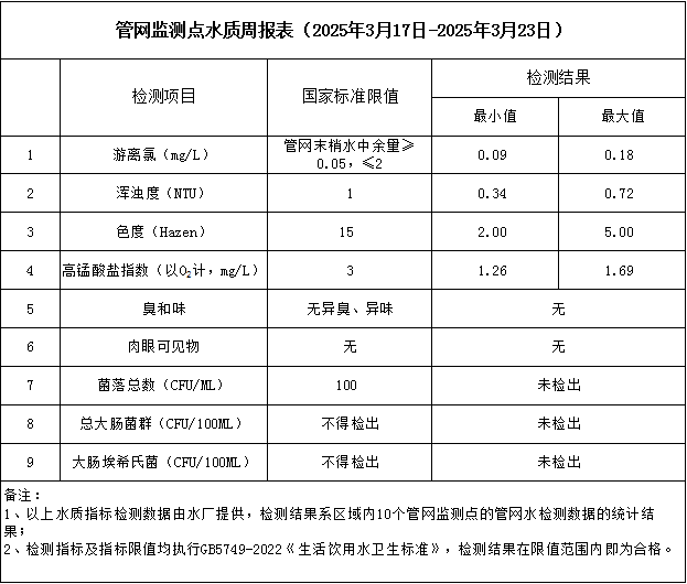 管網監測點水質周報表(2025年3月17日-2025年3月23日)