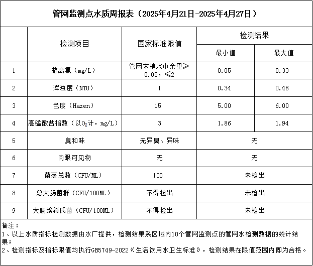 管網(wǎng)監(jiān)測(cè)點(diǎn)水質(zhì)周報(bào)表(2025年4月21日-2025年4月27日)