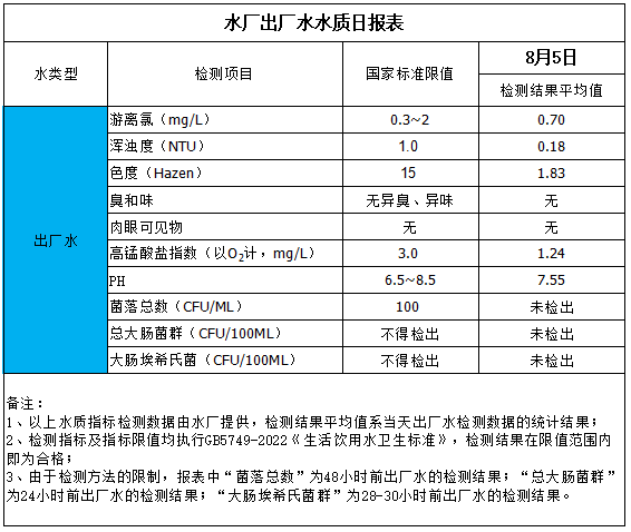 水廠出廠水水質(zhì)日?qǐng)?bào)表(2025-8-5)