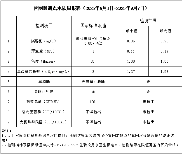 管網監測點水質周報表(2025年9月1日-2025年9月7日)