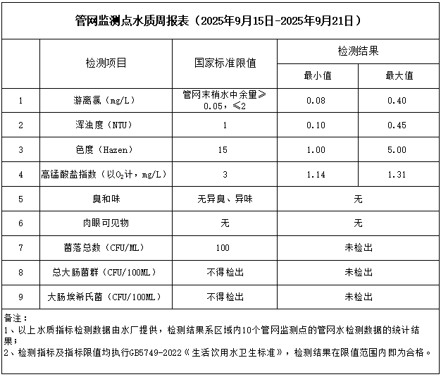 管網監測點水質周報表(2025年9月15日-2025年9月21日)