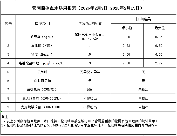 管網監測點水質周報表(2026年2月9日-2026年2月15日)