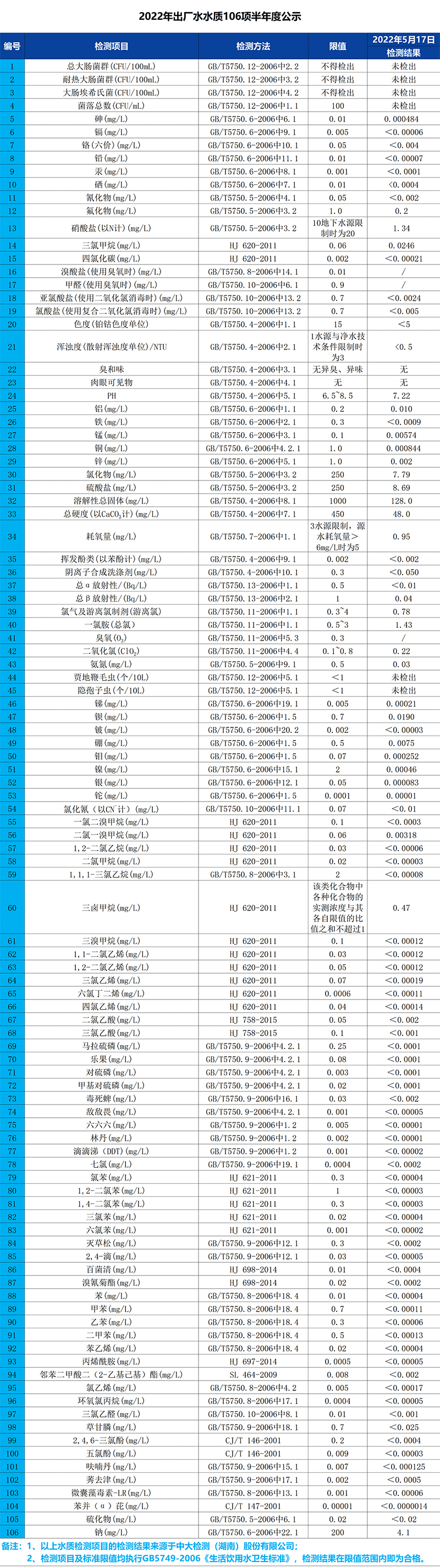 2022年出廠水水質(zhì)106項(xiàng)半年度公示