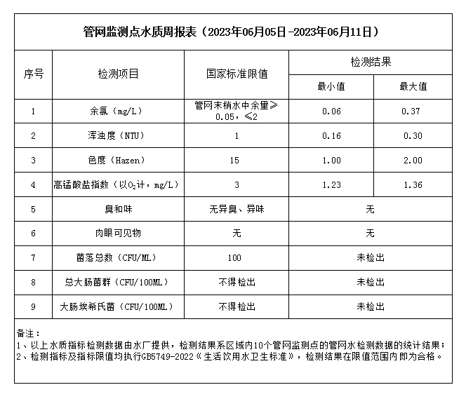 管網監測點水質周報表(2023年06月05日-2023年06月11日)