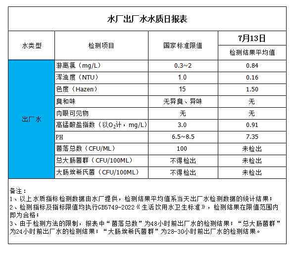 水廠出廠水水質(zhì)日報表(2023-7-13)