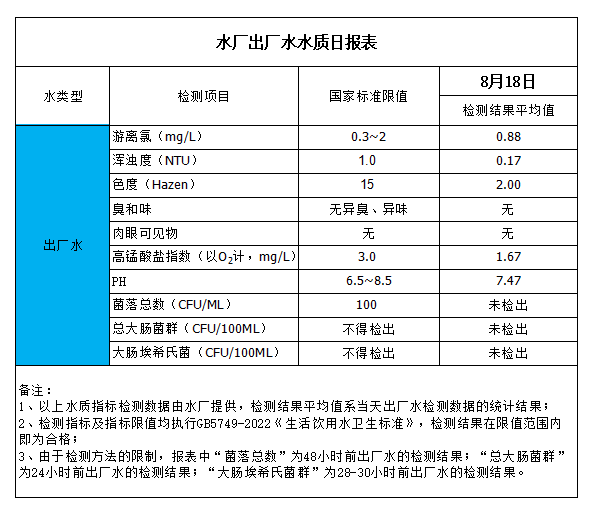 水廠出廠水水質(zhì)日?qǐng)?bào)表(2023-8-18)