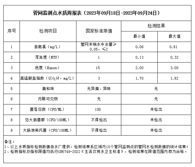 管網(wǎng)監(jiān)測點水質(zhì)周報表(2023年09月18日-2023年09月24日)