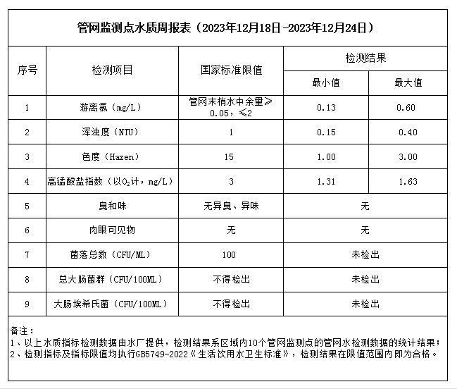管網監測點水質周報表(2023年12月18日-2023年12月24日)
