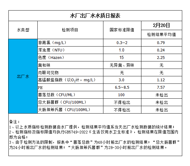 水廠出廠水水質日報表(2024-2-20)
