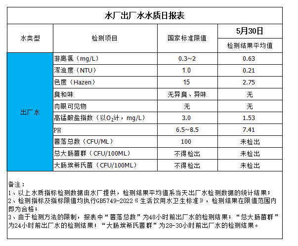 水廠出廠水水質日報表(2024-5-30)